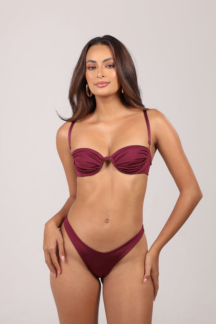 O top (sutiã) Ariel possui uma modelagem drapeada no busto, aro inteiriço e alças reguláveis.